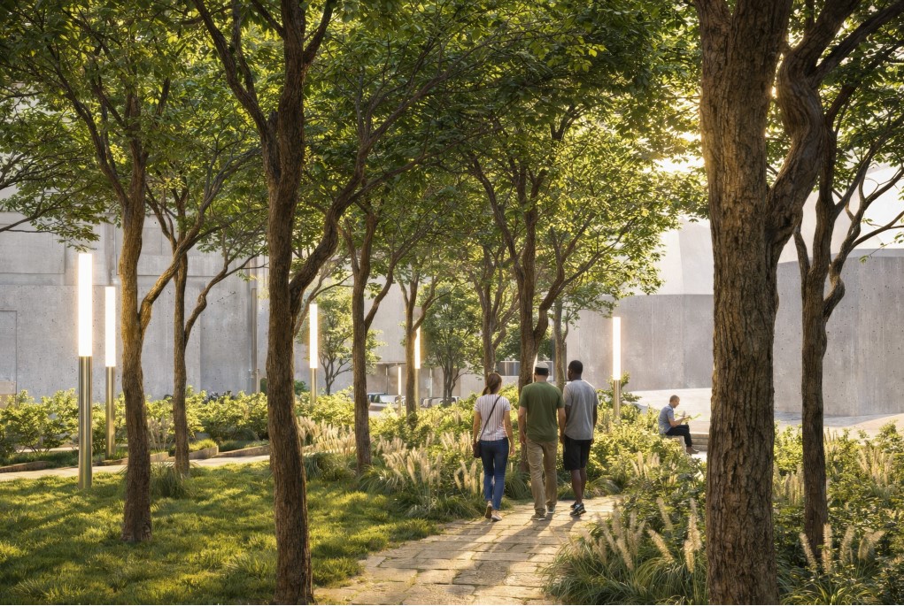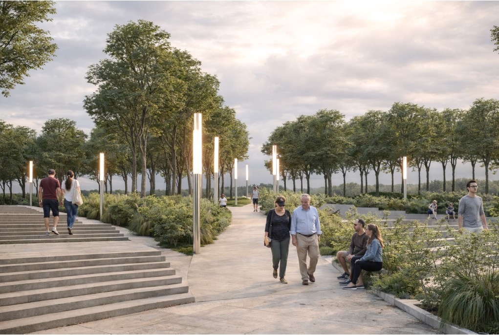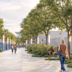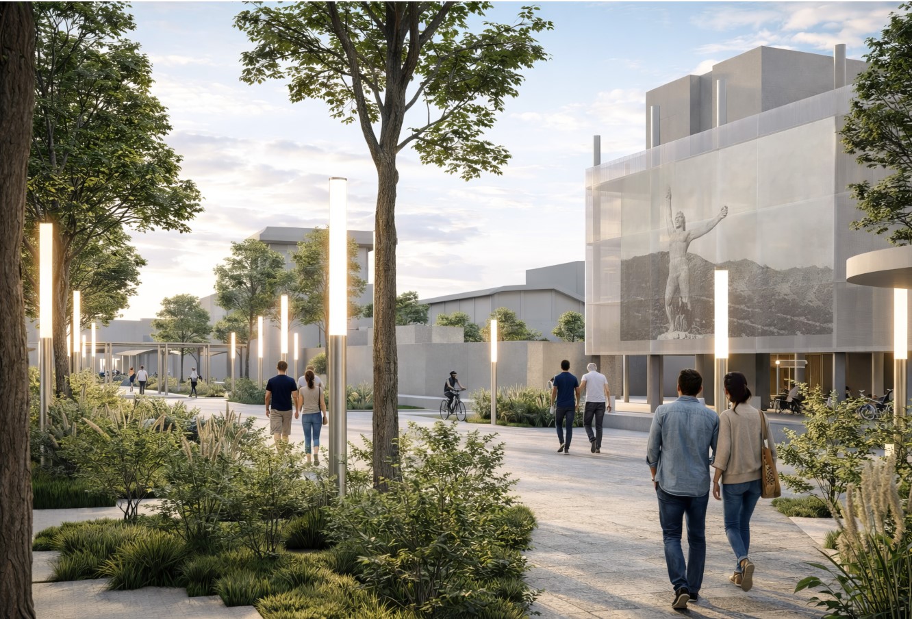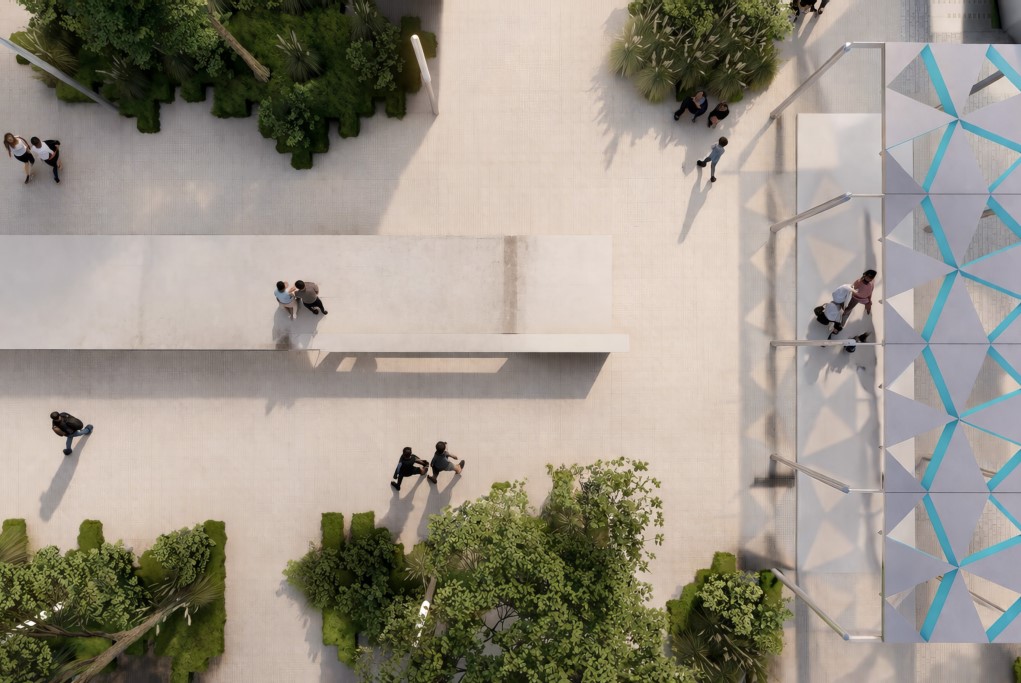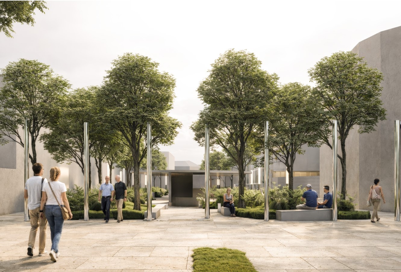 Секој од плоштадите има специфична улога во оваа целина: „Ослободување“ се артикулира како нов репрезентативен урбан простор, „Обединување“ како постоечко јадро кое се дооформува и интегрира во линиска секвенца, додека „Осознавање“ се развива како културна платформа со летен амфитеатар, кој овозможува разновидни јавни и културни настани. Партерното уредување се третира како клучен елемент во обликувањето на целокупниот просторен идентитет и функционалната поврзаност на интервенцијата. Преку внимателен избор и комбинација на материјали, се воспоставува јасен, но суптилен континуитет помеѓу различните просторни сегменти.