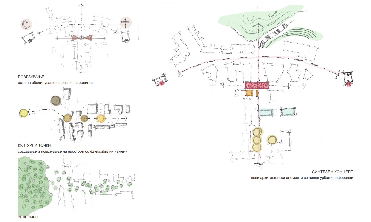 Концептот на плоштадот „Обединување“ во Кичево се заснова на обединување и поврзување на двата значајните религиски објекти во еден плоштад и една пешачка зона со што овој плоштад станува плоштад на две религии. Оваа интевенција го афирмира градот како мултиетнички град во кој различноста не е само присутна, туку длабоко вкоренета во неговото секојдневие. Неговата мултиетничка структура не се доживува како поделба, туку како богатство – како слоевит идентитет кој се градел низ времето, а со оваа интервенција просторно ќе се обедини. Во контекст на мултиетничкиот карактер на Кичево, интеграцијата на верските простори во рамки на заеднички јавен простор претставува силна урбана и симболичка интервенција.