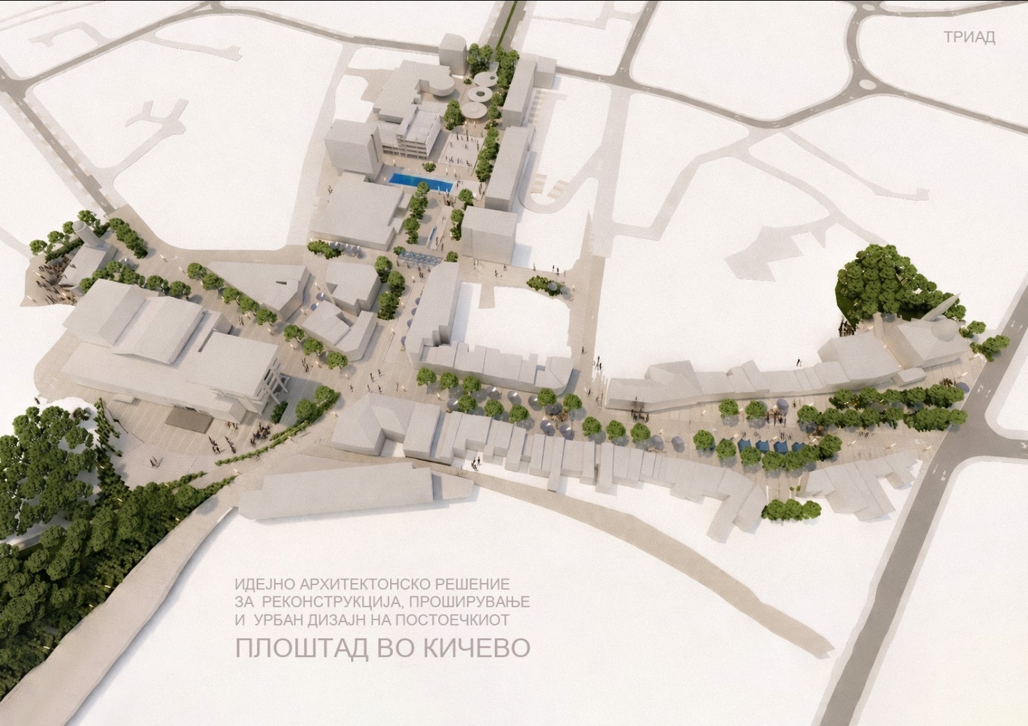 Конкурсниот труд под шифра „ТРИАД“, во споредба со другите наградени дела, се издвои со автентичен и креативен дизајнерски пристап што ги балансира функционалноста, естетиката и поврзаноста со околниот простор. Овој труд покажува многу квалитетно и јасно решение на дадените функции во рамките на условите на урбанистичкиот план. Решението не е само архитектонски хармонично, туку и длабоко осмислено, земајќи ја предвид улогата на плоштадот како „срце“ на градот и неговиот потенцијал да стане автентичен, жив центар на секојдневниот живот во заедницата.