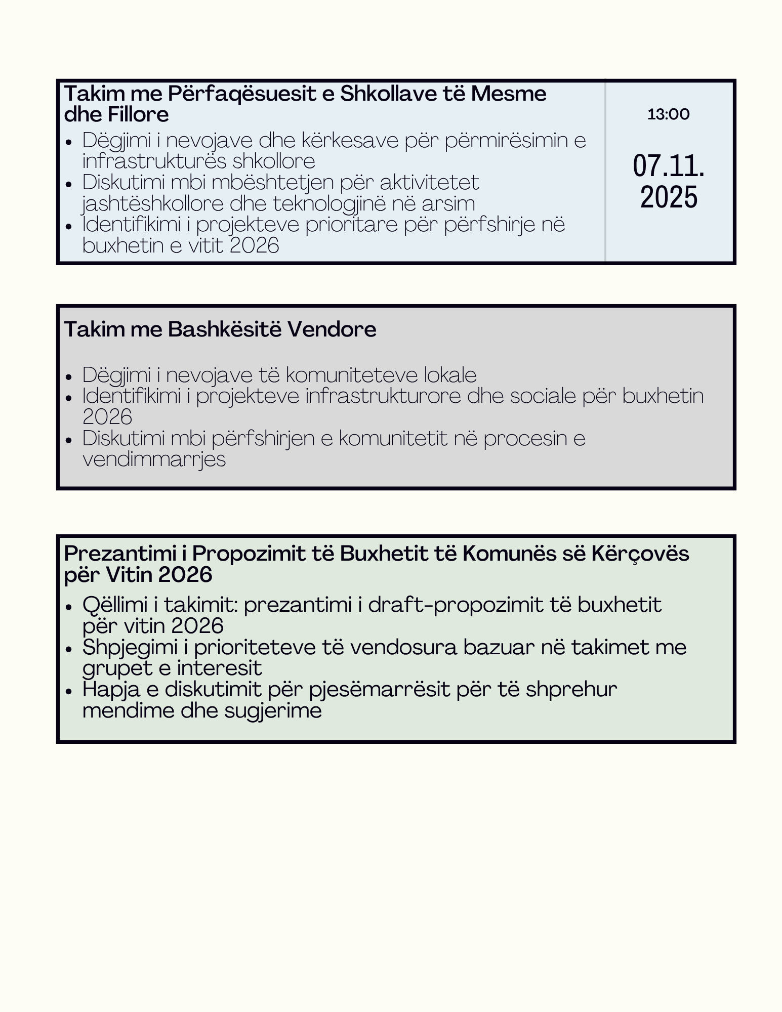 Në këtë kontekst i ftojmë të gjithë qytetarët e Komunës së Kërçovës që të kontribojnë duke na shkruar kërkesat e tyre dhe njëkohësisht të japin vërejtjet, mendimet dhe sugjerimet e tyre për hartimin e buxhetit për vitin 2026 në Komunën e Kërçovës.