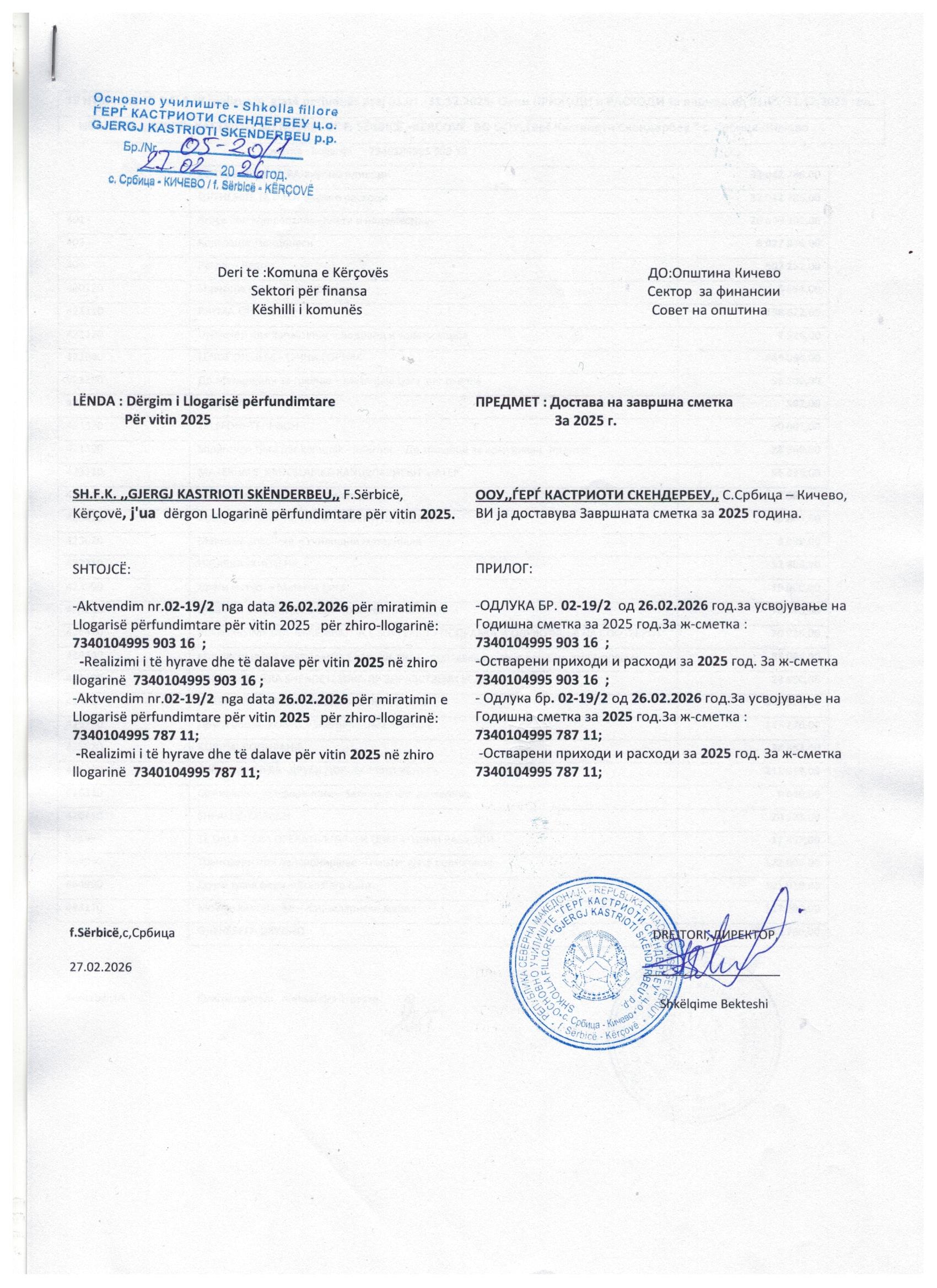 15. Miratimi i Llogarisë përfundimtare për vitin 2025 të SHF “Gjergj Kastrioti Skenderbeu” Sërbicë