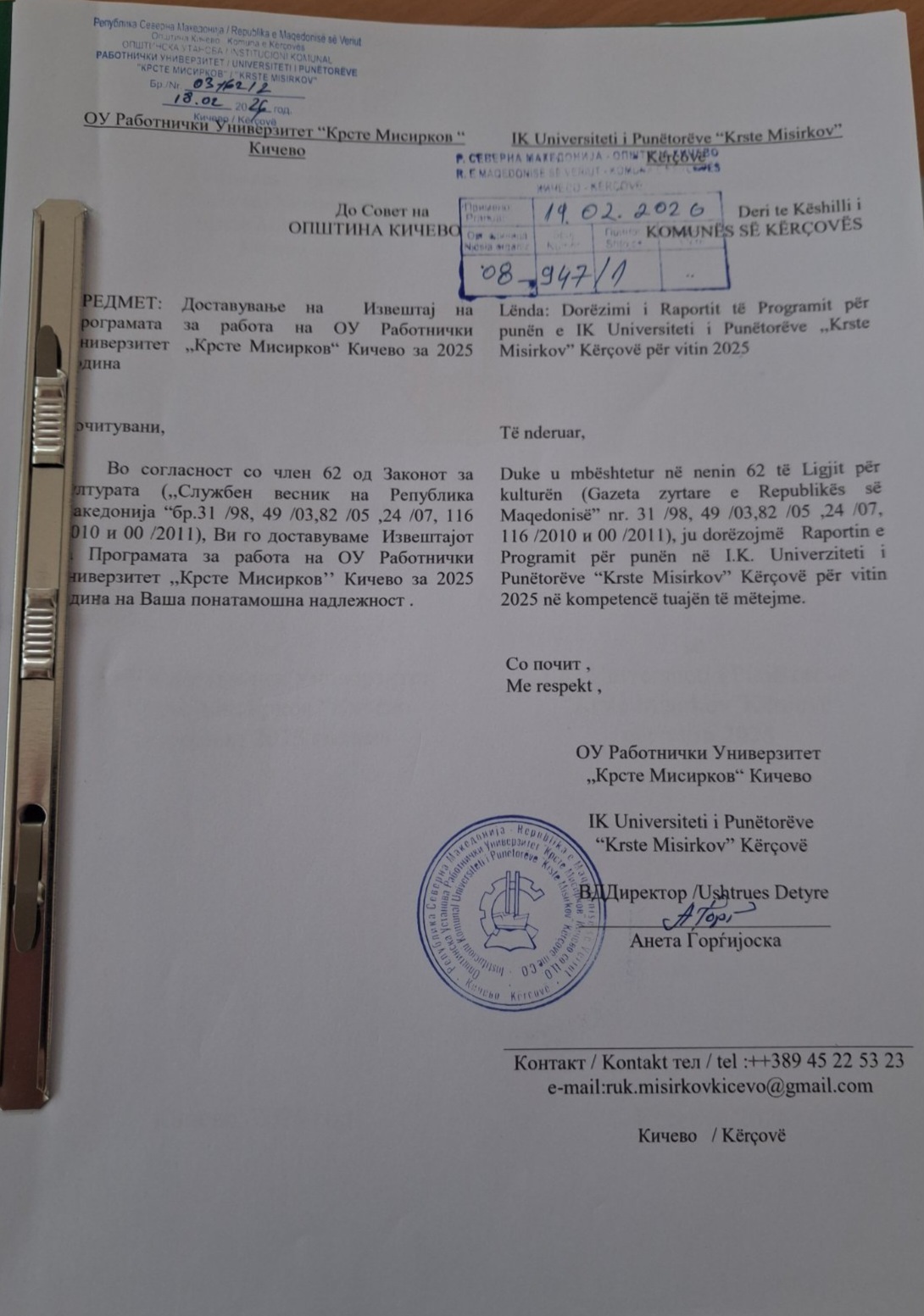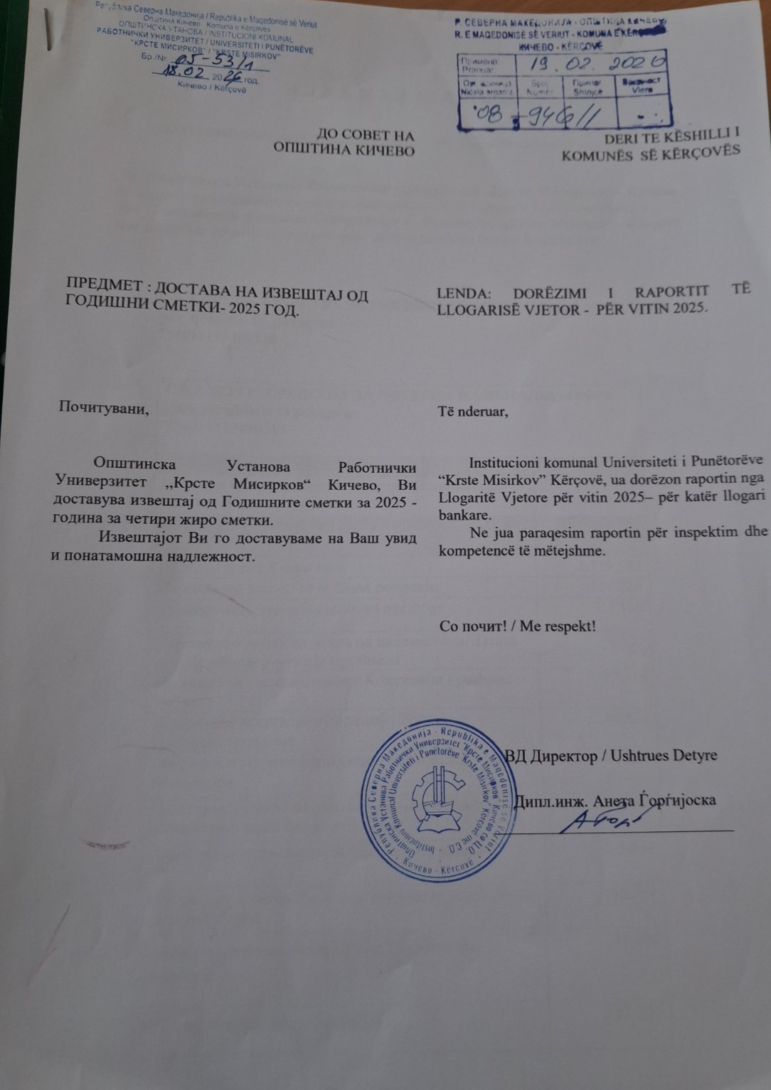 18. Miratimi i Llogarisë përfundimtare për vitin 2025 të IK Universiteti i punëtorve “Krste Misirkov Kërçovë