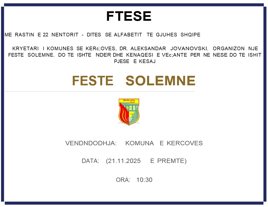 Me rastin e 22 Nëntorit – Ditës së Alfabetit të Gjuhës Shqipe, Kryetari i Komunës së Kërçovës Dr. Aleksandar Jovanovski organizon një ceremoni solemne për të shënuar këtë ditë me rëndësi të veçantë historike dhe kulturore.